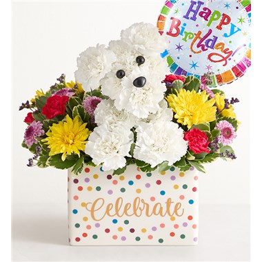 Now, this is a party animal! Our doggone adorable floral pup is hand-designed in a keepsake ceramic vase decorated with polka dots and “Celebrate” in gold script. Get ready to unleash the fun and create many long-lasting memories.