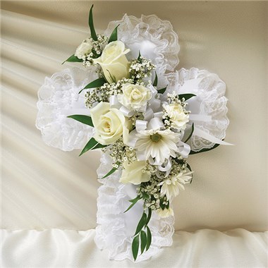 •Cross-shaped satin casket pillow is adorned with a spray of white roses, baby’s breath, ribbon and soft, lush greenery